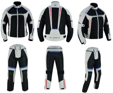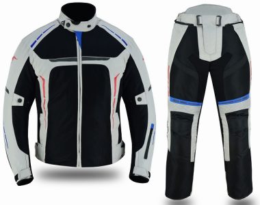 TRAJE DE MOTO DOS PIEZAS, CHAQUETA Y PANTALÓN PERFORADO DE VERANO UNISEX, PROTECCIONES CE VULCANO Y HEFESTO PLATA ROJO AZUL